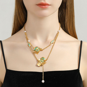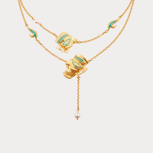 Infused with echoes of ancient mystery, the Bronze Echoes Layered Necklace is a tribute to the legendary masks of Sanxingdui. Featuring two intricately sculpted face motifs in a rich gold tone with turquoise enamel accents, this dual-layered piece is adorned with symbolic flame charms and a graceful drop pearl. Bold yet refined, it's a wearable piece of history that captures the spirit of cultural heritage and modern artistry.