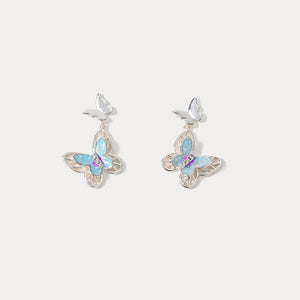 Flutter into elegance with our Butterfly Dangle Earrings. These enchanting earrings feature intricately crafted butterfly silhouettes with shimmering blue and purple inlays, delicately framed in silver-tone outlines. The top is adorned with a polished mini butterfly stud, allowing the larger butterfly to gently sway below—creating a graceful, eye-catching movement with every step.