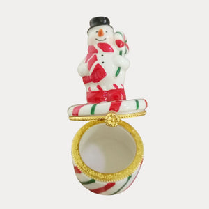Featuring a delightful snowman holding a candy cane, this box is adorned with vibrant red and green candy-striped patterns that radiate holiday cheer. The hinged design opens to reveal a small compartment, perfect for storing tiny treasures or jewelry. Crafted with intricate detailing and a glossy finish, this trinket box makes a whimsical addition to your holiday décor or a thoughtful Christmas gift for loved ones.