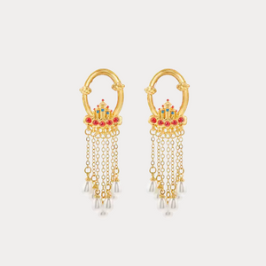 Step into a dreamlike world with the Castle in the Sky Tassel Earrings. Designed with opalescent stones, golden clouds, and a fairytale castle centerpiece, these earrings bring fantasy to life. Cascading chains adorned with teardrop pearls add a sense of graceful motion, making them perfect for magical evenings and whimsical hearts.