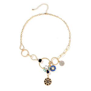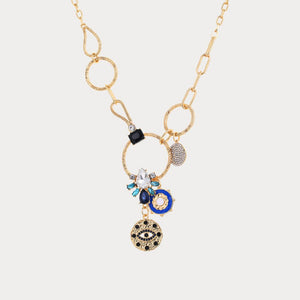 The Celestial Charm Necklace blends elegance and whimsy with its unique combination of gold circles and celestial-themed charms. Adorned with dazzling gemstones and intricate designs, this necklace adds a splash of color and sparkle to your outfit, making it the perfect piece for day-to-night styling.