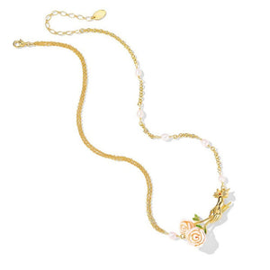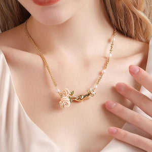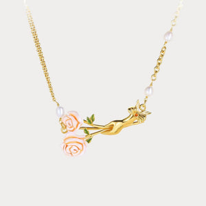 A graceful symbol of love, nature, and elegance. The Champagne Rose Flower Necklace features a sculpted golden hand offering a blooming bouquet of champagne enamel roses, accented by lush green leaves and luminous freshwater pearls. Delicately suspended on a gold-tone chain, this romantic piece captures the essence of vintage charm and poetic beauty. Perfect for gifting or cherishing, it adds a tender, nature-inspired touch to any outfit.