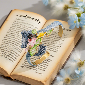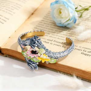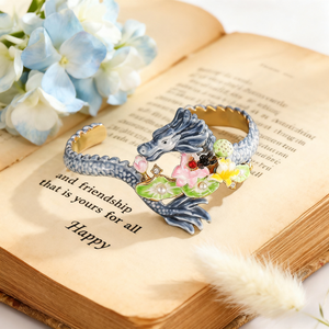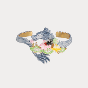 Unleash the power of tradition and elegance with the Dragon Lotus Cuff Bracelet. Featuring a finely sculpted dragon in vivid blue enamel, this piece intertwines with blooming lotus flowers in soft pink, yellow, and green accents. The open cuff design adds a bold statement while ensuring comfort and versatility. A symbol of strength, wisdom, and rebirth, this bracelet is a striking accessory for anyone who dares to wear their story with pride.