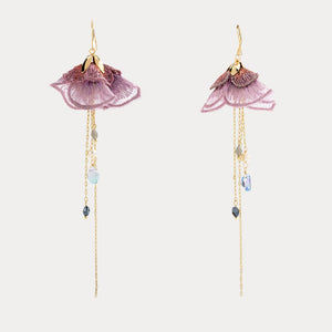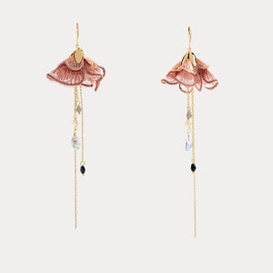 These enchanting earrings feature delicate, handcrafted woven flowers that exude a whimsical and fairy-like charm. The soft, intricate petals cascade gracefully, adorned with elegant golden chains and dainty beads, creating a stunning and mystical effect. Perfect for those who love to infuse their style with a touch of magic and elegance