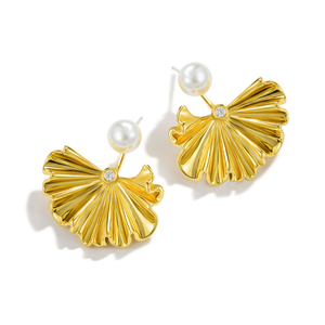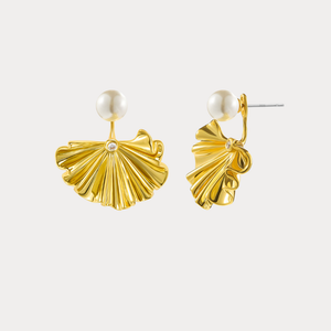 Elegant and timeless, the Gold Ginkgo Leaf Earrings draw inspiration from the graceful beauty of the ginkgo tree—a symbol of hope, resilience, and longevity. Each earring features a sculpted golden ginkgo leaf with a soft, flowing texture, paired with a lustrous pearl stud for a refined touch. The combination of polished gold and gentle pearl creates a harmonious balance between nature and sophistication, making these earrings a perfect statement for both everyday elegance and special occasions.