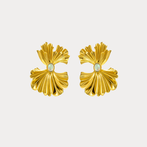 Inspired by the timeless beauty of ginkgo leaves, these gold-toned earrings showcase fluid, sculptural curves that catch the light from every angle. A soft, iridescent opal sits at the centre, adding a gentle glow that enhances their elegant, nature-inspired design.