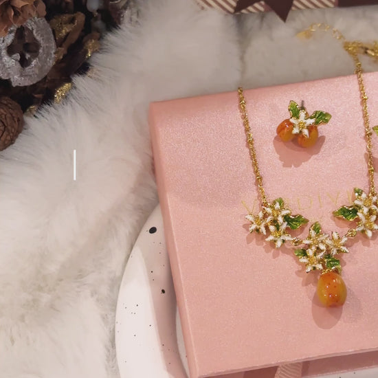 This breathtaking piece captures nature's grace and refined artistry, featuring delicate blossoms and a radiant golden apricot . The gold-toned chain perfectly complements the pendant, drawing attention to its intricate details.