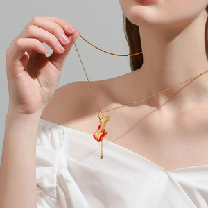 Strike a chord of style with this vibrant Guitar Charm Pendant. Crafted in gleaming gold-tone with a striking red enamel body, this miniature electric guitar captures the spirit of music and creativity. A dainty chain detail with a musical note charm adds extra rhythm and flair. Perfect for music lovers, performers, or anyone who wants to wear their passion close to their heart, this pendant is a bold statement of individuality and artistry.