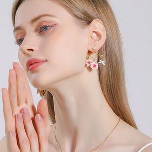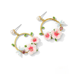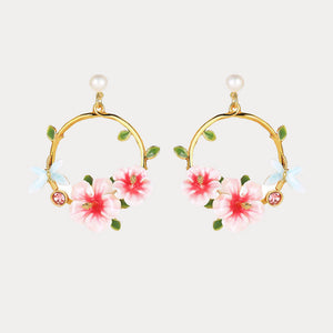 Crafted from gold-plated brass, they feature enameled white-pink hibiscus blooms, vibrant green leaves, and a delicate light blue butterfly. Each detail is meticulously hand-painted, enhancing the earrings' vividness and charm. Perfect for adding a floral, sweet, and elegant touch to any outfit, these earrings bring a delightful burst of nature's beauty to your jewelry collection.