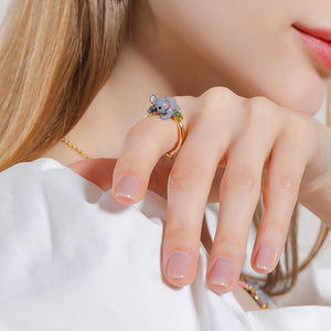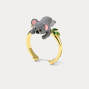 This charming piece features a lifelike enamel koala, meticulously crafted and perched playfully on an 18K gold-plated brass band. The koala's endearing expression and delicate leaf accents bring a sense of natural beauty and joy to any outfit. Adjustable to fit most sizes, this ring is perfect for animal lovers and those who appreciate unique, nature-inspired accessories.
