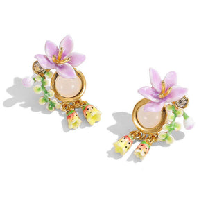 These Tropical Blossom Drop Earrings offer a delicate blend of floral elegance and playful charm. Featuring soft lilac petals, intricate leaf detailing, and dainty dangling flower buds, these earrings capture the beauty of nature in a sophisticated design. Perfect for adding a fresh, whimsical touch to any look.
