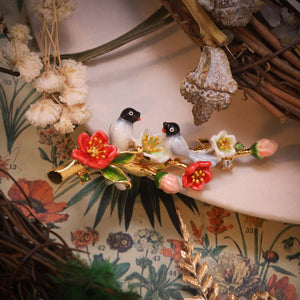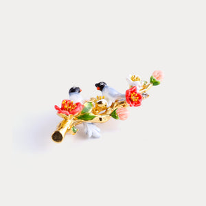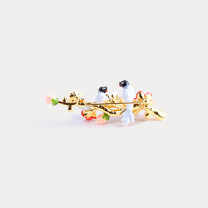 The perfect blend of whimsy and elegance, this brooch depicts two magpies among blossoming flowers. Its vivid colors and exquisite detail make it an ideal statement piece for your wardrobe.