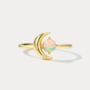 A celestial masterpiece, this ring showcases a radiant opal embraced by a crescent moon and accented with a sparkling crystal. The delicate gold band enhances its ethereal beauty, making it the perfect statement piece for those enchanted by the night sky.