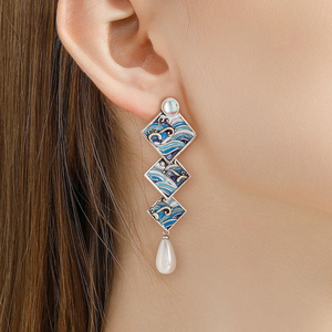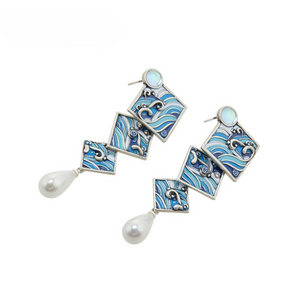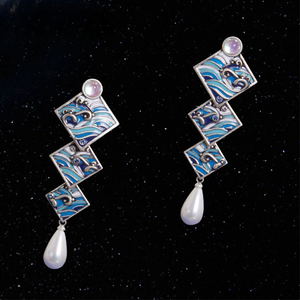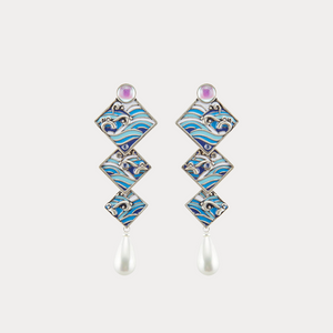 Gracefully cascading like waves under moonlight, the Moonlit Ocean Dangle Earrings are a statement of poetic motion. Featuring three ocean-inspired enamel tiles in varying shades of blue, these earrings flow downward to end in a delicate teardrop pearl. Topped with a glowing moon-like gem, this design evokes the rhythm of tides and the serenity of moonlit waters. Ideal for those who love the ocean's depth and dreamlike beauty.