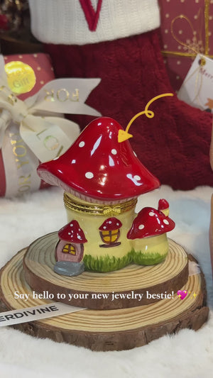 Step into a fairytale world with this enchanting mushroom cottage trinket box. Featuring hand-painted details of a quaint red mushroom house, it’s a magical place to store tiny treasures and adds a whimsical charm to any space.