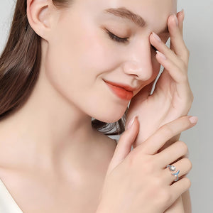 This enchanting ring brings the balance of day and night to your fingertips. Featuring a glowing opal sun paired with a crescent moon embellished with blue crystals, the intricate twisted band adds a touch of elegance and sophistication. Ideal for celestial jewelry enthusiasts.