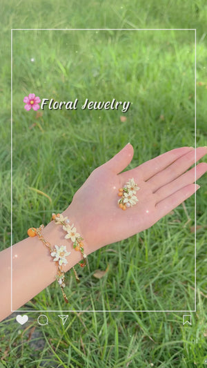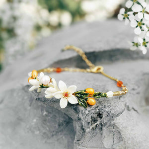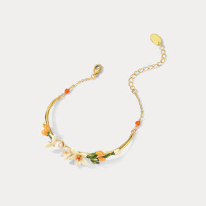 The Verdivine Orange Blossom Bracelet captivates with its intricate design, featuring a delicate enamel floral motif complemented by a lustrous pearl, set against a gleaming 18k gold chain. It's a piece that beautifully embodies the essence of nature and sophistication, perfect for adorning the wrist with a touch of whimsy and elegance.