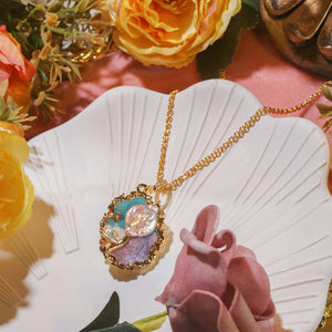 Discover timeless elegance with our Pearl Flower Pendant Necklace from the Flower Collection. This vintage-inspired piece features an oval-shaped pendant framed in ornate gold, showcasing a delicate blooming flower with a lustrous baroque pearl at its center. Soft pastel tones and intricate detailing evoke the charm of a botanical painting, blending nature’s grace with artistic sophistication. A true statement of refined beauty and classic femininity.