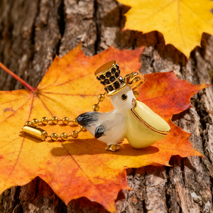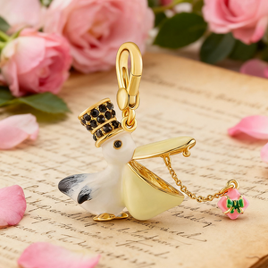 This is a Pelican Charm Pendant featuring a whimsical pelican design with a black gemstone-studded top hat, golden beak, and a dangling pink flower charm. The detailing combines playful elegance with fine craftsmanship, making it a charming accessory that stands out as both unique and stylish.