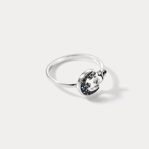 Celebrate whimsical charm with the Silver Moon Cat Ring. Featuring a playful cat perched on a crescent moon with sparkling starry accents, this ring adds a dash of celestial magic to any jewelry collection.