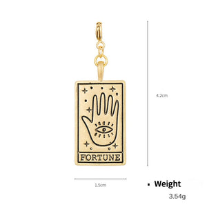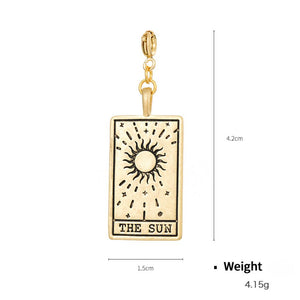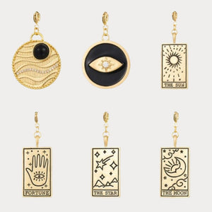Each piece is thoughtfully designed with intricate details such as engraved symbols, shimmering accents, and golden finishes, featuring motifs of stars, moons, and cosmic elements. Perfect for layering or as a standalone charm, this collection adds a touch of mystique and elegance to your everyday look.
