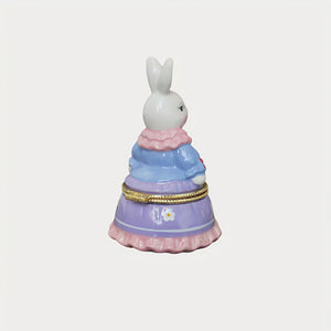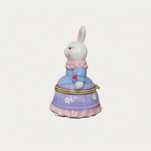 This elegant trinket box showcases a charming bunny dressed in a Victorian-style outfit, complete with delicate floral accents and a gold-trimmed base. Perfect for collectors or as a decorative storage piece, it brings a vintage touch to any setting.