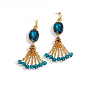 Make a bold and elegant statement with the Vintage Tassel Beaded Earrings. Featuring deep sapphire-blue oval crystals and cascading gold chains adorned with teal beads, these earrings evoke timeless glamour with a touch of playful movement. Perfect for adding a pop of colour and vintage charm to your look—whether for a soirée or a chic everyday ensemble.