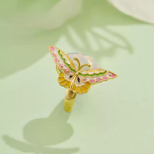 Graceful and enchanting, the Butterfly Ring showcases a delicately enamelled butterfly in pastel pink, green, and golden tones, resting atop a luminous moonstone-like cabochon. Crafted in a polished gold-tone finish, this adjustable ring captures the beauty of nature in flight, symbolising transformation and elegance. Perfect for adding a whimsical yet sophisticated touch to your everyday style or special occasions.