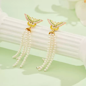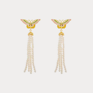 Elegant and whimsical, the Butterfly Tassel Earrings feature pastel enamel butterflies in soft pink, green, and gold tones, paired with cascading strands of delicate pearls. The flowing tassels create graceful movement, while the butterfly design symbolises transformation and beauty. Perfect for adding a romantic, nature-inspired touch to both daytime and evening looks.
