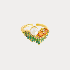 A striking fusion of colour and elegance, the Emerald Feather Ring features a vibrant fan-shaped design adorned with emerald-green enamel, dazzling orange crystals, and a lustrous pearl centerpiece. Accented with sparkling cubic zirconia, this adjustable gold-tone ring captures the beauty of exotic feathers while offering a comfortable fit. Perfect for adding a bold yet sophisticated touch to any look, it’s a statement piece that transitions effortlessly from day to night.