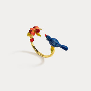 This stunning ring is designed exclusively to declare love and passion. Featuring a Magpie perched beside a blooming flower or rosy berries, this romantic adjustable ring is a unique creation. Its exquisite enameled craftsmanship adds intricate beauty, while the floral elements provide a sweet, natural touch. A delicate and beautiful ring, it makes an ideal gift to complement and surprise the one you love.