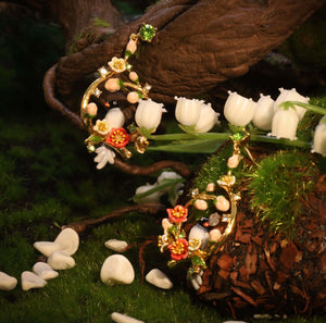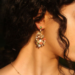The enchanting garland-style earrings are adorned with vibrant flowers and a charming magpie. These earrings bring a touch of playful elegance to your ensemble.