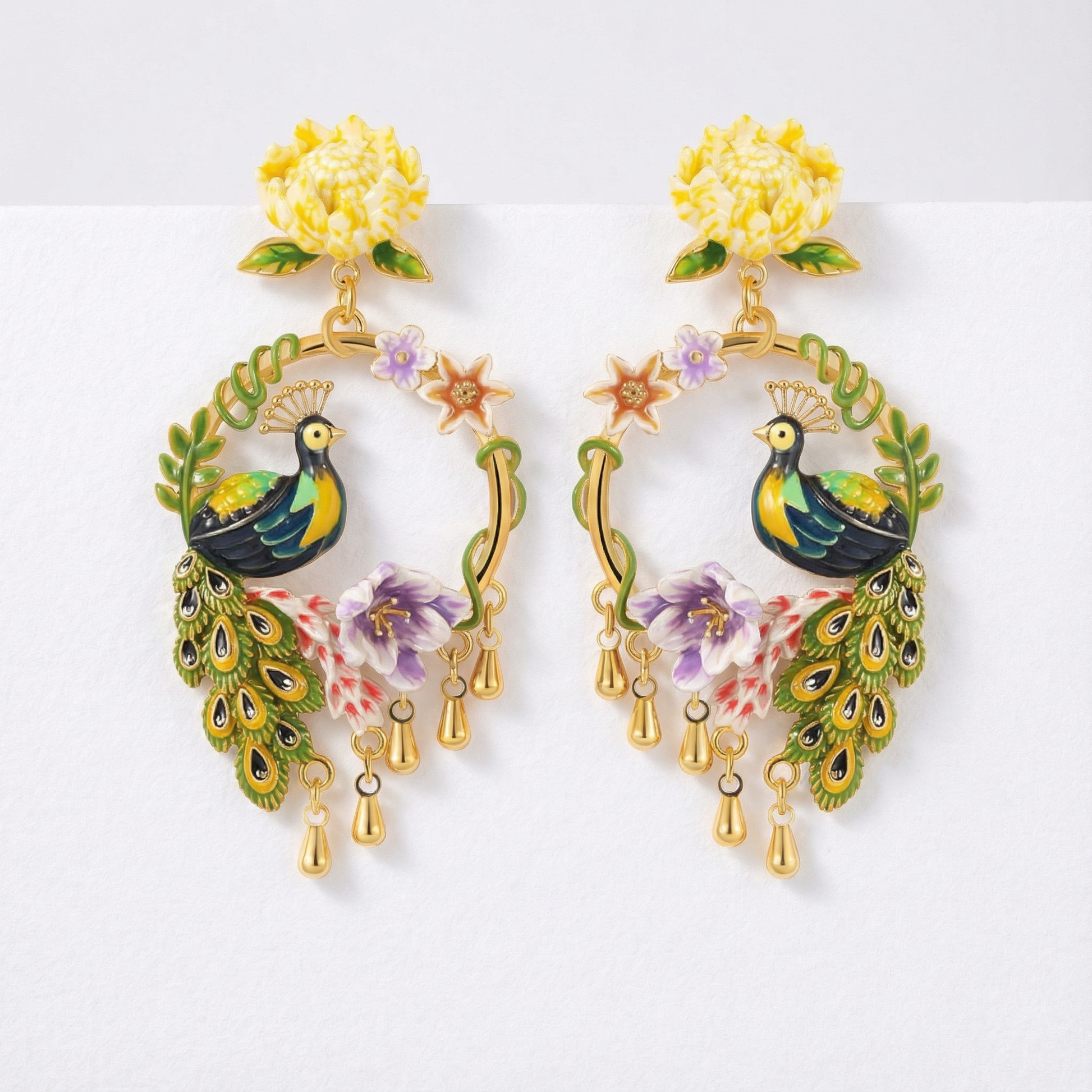 Introducing the Enchanted Peacock Earrings, a stunning blend of elegance and whimsy. These exquisite earrings feature a vibrant peacock, intricately hand-enameled in rich hues, perched amidst blooming flowers. Adorned with delicate golden droplets, these earrings are a celebration of nature's beauty and artistry. Perfect for special occasions or adding a touch of magic to your everyday look.