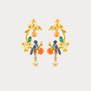 A poetic blend of elegance and nature, the Persimmon Magpie Hoop Earrings capture the warmth of autumn in vivid detail. Hand-painted enamel magpies perch among golden branches adorned with blooming flowers, emerald-green leaves, and ripe persimmons. Crafted in a luxurious gold-tone finish, these earrings symbolise happiness, good fortune, and joyful reunion — a dazzling tribute to oriental artistry and nature’s harmony.