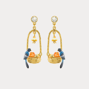 Elegant and symbolic, the Persimmon Magpie Hoop Earrings feature hand-painted magpies resting on golden baskets filled with vibrant persimmons and delicate blossoms. Accented with shimmering crystals and intricate enamel detailing, this design embodies joy, harmony, and prosperity — a graceful statement that celebrates life’s sweetest moments.