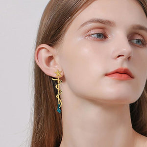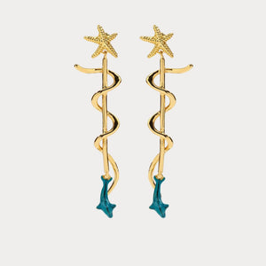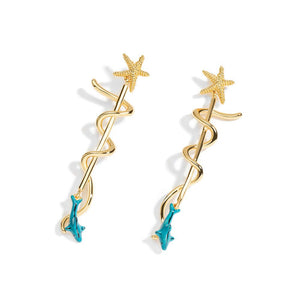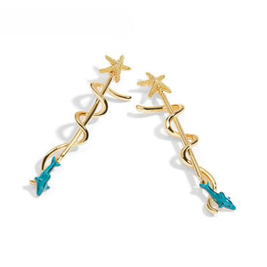 Embrace the beauty of the ocean with our Dolphin Dangle Earrings! Featuring a graceful gold-tone wave design intertwined with delicate dolphins and topped with a shimmering starfish, these earrings capture the spirit of the sea. The playful yet elegant design makes them a perfect statement piece for ocean lovers. Wear them to add a splash of marine charm to any outfit!