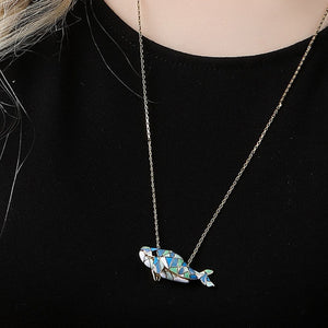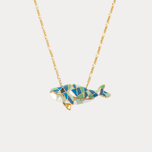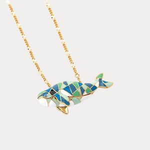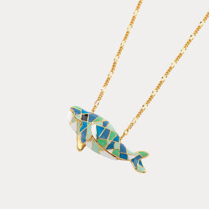 This enchanting piece features a mosaic-like design, with Dolphin crafted from colorful enamel and framed in 18k gold plating. The intricate patterns and hues create a striking visual effect, making this necklace a perfect statement piece for any outfit.