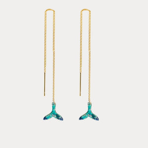 These elegant earrings feature a delicate Mermaid Tail motif in vibrant blue enamel, adorned with subtle star patterns that glisten like the night sky. The Mermaid Tail charms dangle gracefully from a sleek gold chain, creating a stunning visual effect with every movement.