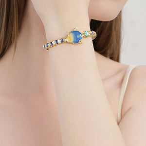 Immerse yourself in the cosmic beauty of the Blue Starry Night Bracelet. This exquisite piece is a celebration of the night sky, featuring a captivating blend of colors and gemstones that mimic the swirling hues of a starry night. The centerpiece is a uniquely patterned stone in shades of blue and yellow, reminiscent of a celestial body.