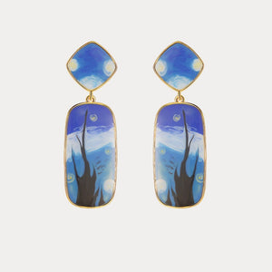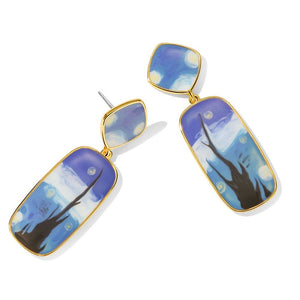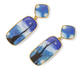 Embrace the beauty of the cosmos with the Blue Starry Night Drop Earrings. These earrings feature a rectangular design inspired by the swirling patterns of a starry night, framed in gold-tone settings. The top section mirrors the night sky with soft blue hues, creating a captivating, celestial look perfect for any occasion.