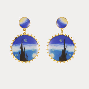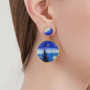 Capture the night sky's magic with the Blue Starry Night Earrings. These round earrings feature a stunning design inspired by the swirling patterns of a starry night, framed with gold-tone details. The vibrant blue hues and intricate patterns make these earrings a perfect statement piece for any occasion.