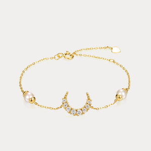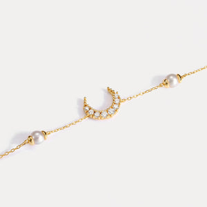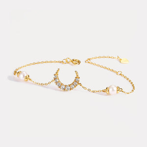 Elevate your style with the Crescent Moon Bracelet, a delicate combination of radiant crystals and luminous pearls. The crescent moon centerpiece sparkles with brilliant stones, exuding an aura of celestial elegance. Perfect for adding a touch of sophistication to both casual and formal outfits.