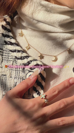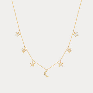 Featuring a series of intricate celestial charms, including shimmering stars and a crescent moon, this piece captures the magic of the night sky. A perfect gift for dreamers and stargazers alike.