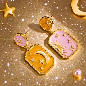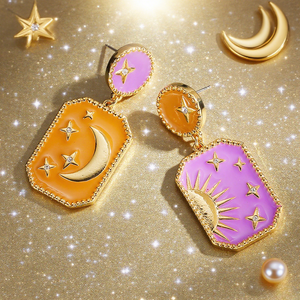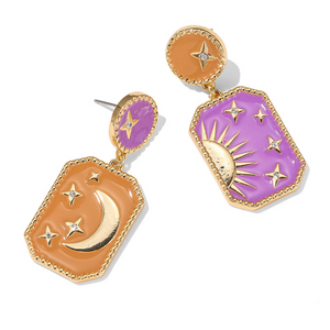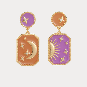 Add celestial allure to your style with these Moon Star Drop Earrings. Designed with mismatched panels, one features a golden crescent moon and stars against a warm orange enamel backdrop, while the other showcases a radiant sun with stars on a violet background. Embellished with sparkling crystals and framed in gold-tone detailing, they capture the beauty of day and night in perfect harmony. A striking statement piece for lovers of cosmic-inspired jewellery.
