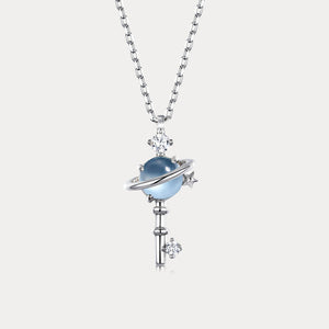 Inspired by the quiet wonder of the night sky, the Saturn Halo Topaz Necklace features a luminous blue topaz orb encircled by a sleek Saturn ring. Delicate star accents and sparkling crystals complete this celestial design, creating a pendant that feels both dreamy and sophisticated.