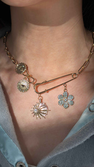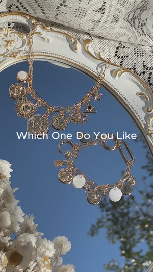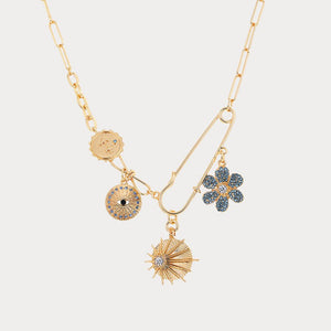 The Sun & Clover Necklace features a modern gold-tone chain with dazzling charms, including a radiant sun, sparkling clover, and intricate coins. Designed to elevate your look with timeless charm and sophistication, this necklace is an eye-catching addition to any outfit.