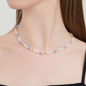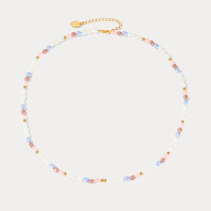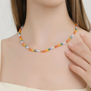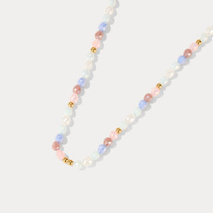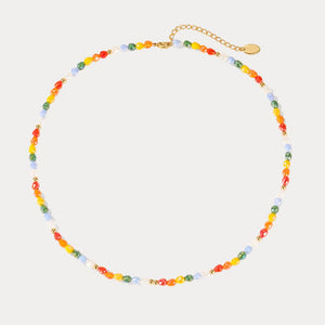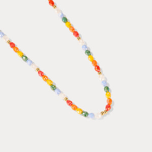 This necklace features a beautiful array of beads, each one carefully selected for its vibrant hue and sparkling luster. The beads are strung together on a gold-plated chain, with gold accents adding a touch of elegance.