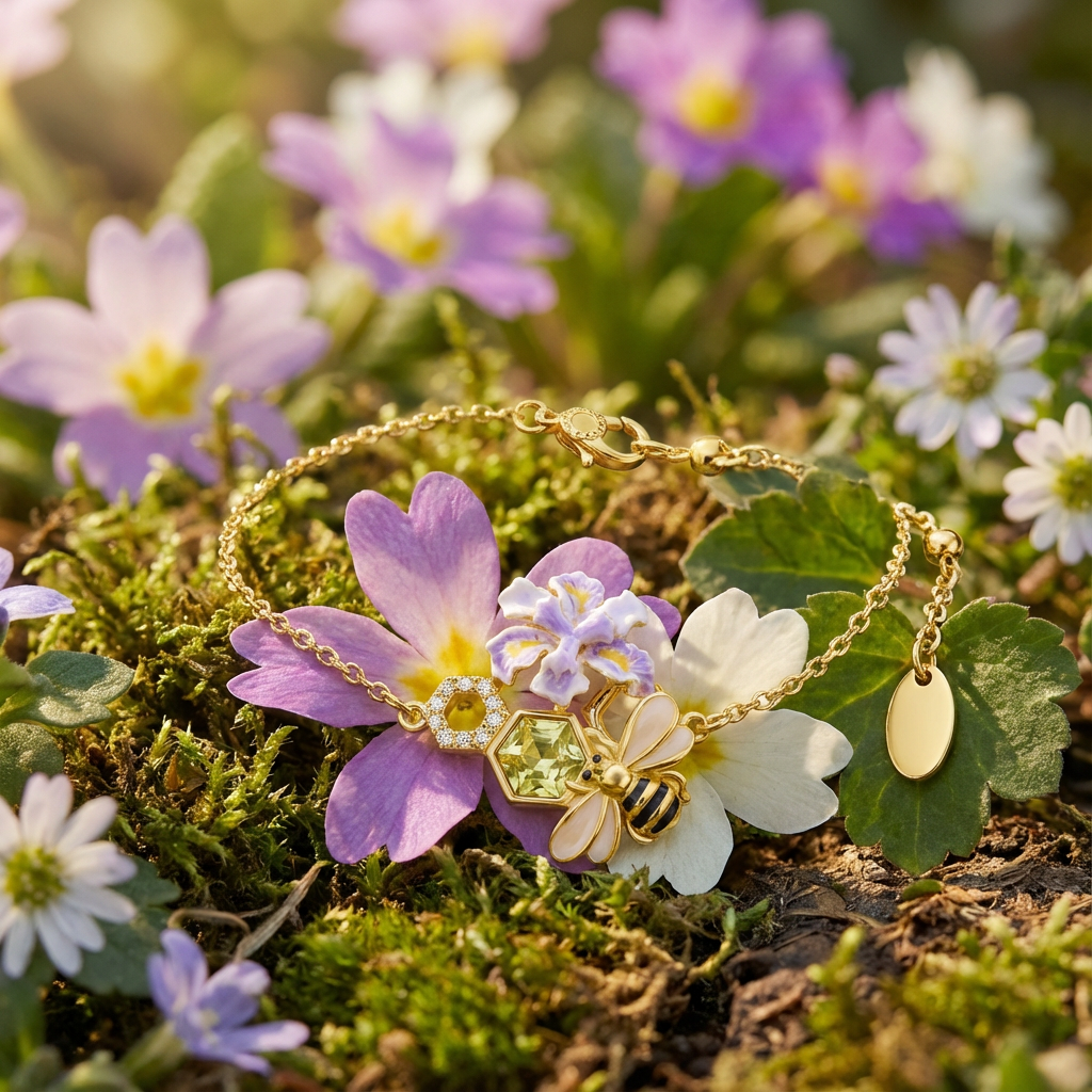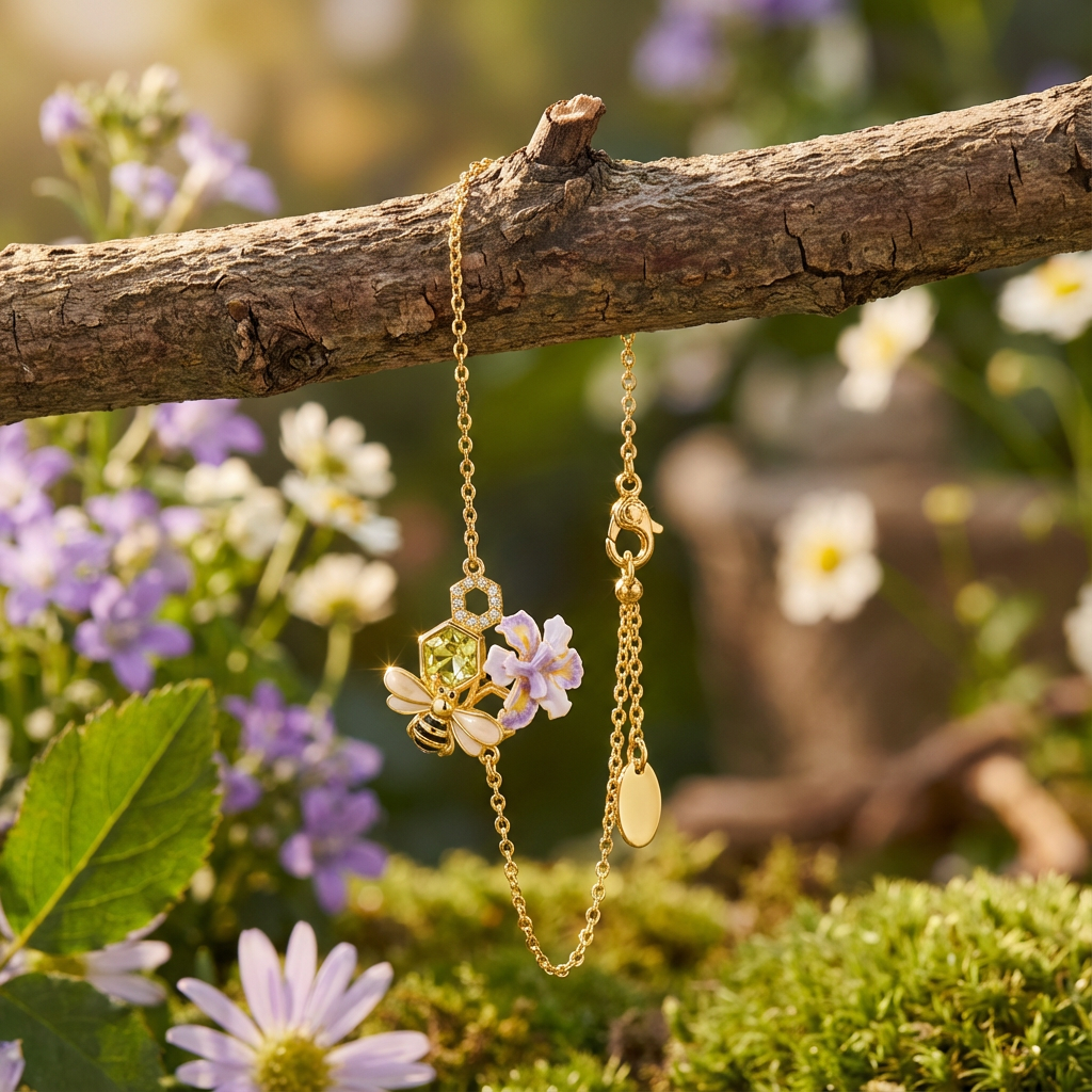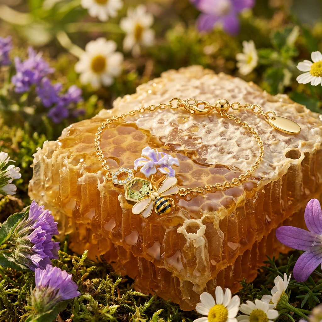 Delicate and full of charm, this Honey Bee Bracelet features a sweet bee motif nestled among floral details and a subtle honeycomb accent. Warm gold tones pair beautifully with soft pastel highlights, creating a design inspired by nature’s gentle rhythm. Light and graceful, it adds a touch of elegance and warmth to everyday wear or thoughtful gifting.