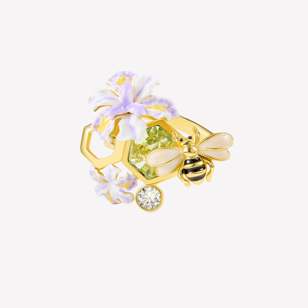 Delicate yet full of life, the Honey Bee Ring captures a golden moment in nature. A graceful bee rests among soft enamel blossoms and honeycomb details, highlighted by a sparkling crystal accent. The warm gold-tone finish and pastel florals create a design that feels both playful and elegant. Symbolising dedication, sweetness, and new beginnings, this ring is a charming statement piece that adds a touch of joy and nature-inspired beauty to everyday wear.