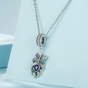 The Peacock Feathers Pendant Necklace features a delicately sculpted feather adorned with sparkling multicolored crystals and a brilliant sapphire-blue centerpiece. Inspired by the vibrant elegance of a peacock’s plume, this pendant radiates bold charm and intricate craftsmanship. Suspended from a shimmering silver chain, it’s perfect for making a statement—day or night.